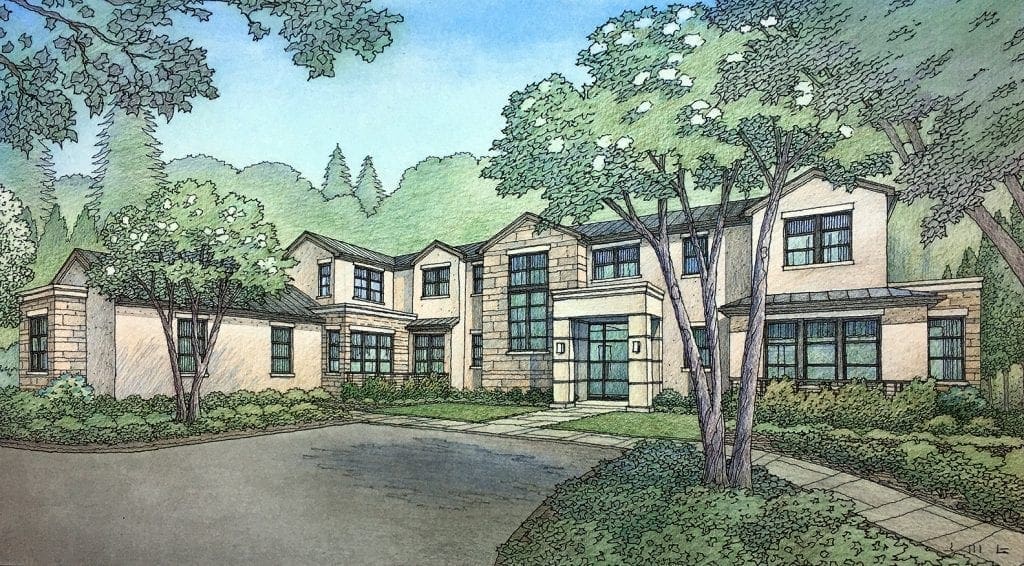 This one had a client for whom it was designed, taking into account their particular needs and desires.  Located in Los Altos Hills, California, this is a very large residence including a large subterranean level to increase indoor space while remaining in compliance with site setbacks required by local ordinances.  The renderings for this project and others like it are created in the color pencil technique and are fairly large.  Typically each illustration is 12 inches by 22 inches on illustration board.  I draw a black and white line drawing of this view first, then print it onto a vellum, which is then dry mounted onto illustration board.  Then color media is applied slowly-starting with chalk pastel, then color pencil over that.  If there are any pure whites within the drawing, then those areas are simply uncolored areas.  The darker areas of the rendering are built up with successive layers of color pencil, sometimes using multiple color pencils within the same area in order to achieve the right color and character for the material you are trying to show.  This particular design was mostly cement plaster with some ledgestone accents, a zinc metal roof with minor built-up flat roof areas and few precast lintels and sills.  My tendency is to keep all colors in a somewhat neutral range due to the neutral color scheme dictated by the design.  So, the greens in the landscaping, the trees, even the water in the pool and the colors of the sky are not brightly colored-instead more muted tones to complement and support the main subject-the architecture.