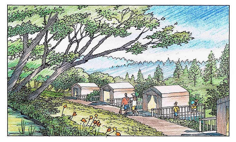 A new vision for a Craft School has emerged in the Sierra Foothills of northern California. These illustrations were done to portray the current design ideas and character of this project which is in the early phases of design. The brainchild of Leslie Barbazette and Jay Morgan, the Wolf Craft School and Collective is for people who enjoy woodworking, blacksmithing, ceramics, and handcrafts. Located in the beautiful countryside between Grass Valley and Auburn, the 16 acre parcel upon which Barbazette and Morgan reside currently, would have outstanding views of the local hillsides, ponds, waterways, oak trees, and just enough simple structures to support the school’s functions. Millennium Engineering of Nevada City, California, has done the land planning and designed the required structures to sit comfortably on the largely wooded piece of land. These small classroom buildings and compact studios are designed to blend in with the natural landscape, using earth tones and non-combustible materials. There are also modest tent cabins on raised wooden platforms, each having their own air conditioner, shower, and bathroom. Near the tent cabins is a respite area with shade oaks, picnic seating, and a food truck–maybe a movie screen for late summer evenings. Any new landscaping will be mostly native and drought resistant plants, with an area for raised bed vegetable planting for on-site consumption. The color renderings shown here were done recently by Jeffrey Michael George to describe the conceptual design to the public. The image above shows the overall site from Wolf Road with proposed buildings and landscaping. The other three illustrations below show various aspects of the design–the ceramics studio, the classrooms, and the tent cabins, as they are set into the landscape of the foothills. Jeffrey is a professional architectural illustrator who brings to life the designs of many architects, engineers, and builders all across America.