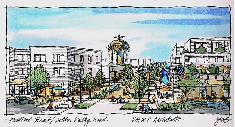 I am showing two urban design renderings in this article that I created recently. I was commissioned by Van Meter Williams Pollack Architects in collaboration with the Hennepin County Planning Grants Program of Minnesota. These are the kind of drawings that attempt to capture a designer’s intentions without the benefit of having the time to work out all of the details. In the architect’s own words: “In order to effectively communicate proposals for complex urban design vision, vibrant and easily-understandable imagery is necessary. The challenge is that there is not much solid content for the render to use as a foundation. Jeffrey works with minimal guidance and answers to a few trenchant questions to produce detailed images evoking the exact sense of place that we are attempting to achieve in our work. “Of course, if the project is funded, then the design work begins in earnest, and the project–and the architect’s design–moves from mere concepts to actual buildings and public spaces. So for the preliminary drawings you see here, a simple SketchUp model is used to generate the perspective, and the rest is “sketched over” by me, using general directions from the architect/urban designer. The water tower and some of the buildings shown here are currently there on the site. The idea was to dress up the water tower with painted graphics and special lighting elements. Some other existing buildings either remain as they are now, others are re-purposed to better serve the community. Much of what we are trying to convey with these renderings is the street and sidewalk life, wide walking and biking paths, street trees, lampposts, outdoor dining and seating, streets that share limited driving with pedestrians, etc. The bottom view shows a generous connection with and existing Trailhead that’s popular with the public now. The whole idea is to revitalize a small urban area that is not living up to its potential presently. I have created many of these conceptual images over the years for many communities across the U. S.